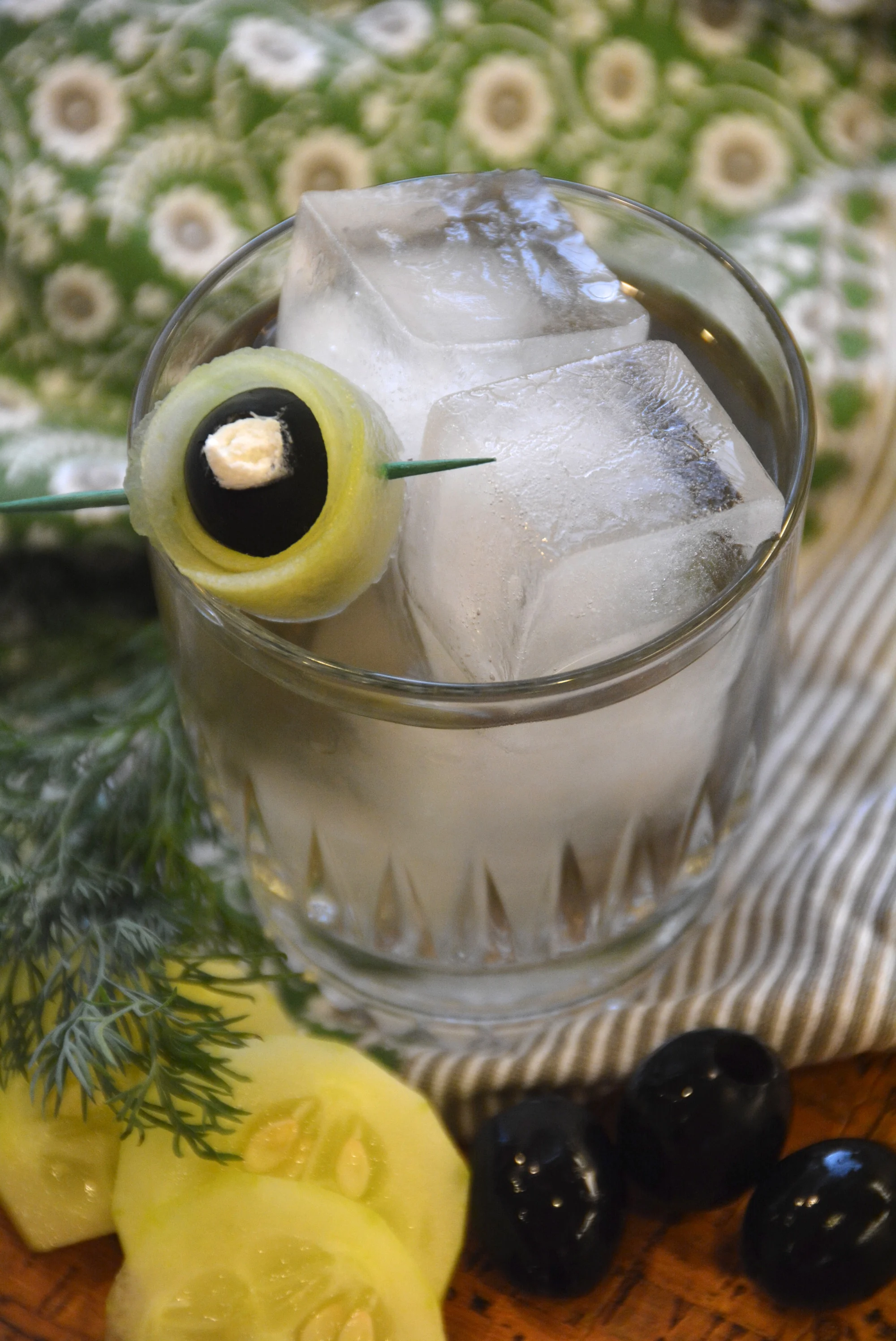 Cocktail directions: Slice up the cucumber and add it to a measuring pitcher. Add the olive and dill infused gin, and muddle until the cucumber starts to break apart. Strain the cucumber and gin into a martini shaker filled with ice. Add the green charteuse, orange bitters, and lemon juice. Shake well. Strain into a martini glass or rocks glass with ice and garnish with a goat cheese stuffed olive wrapped in a cucumber peel.
