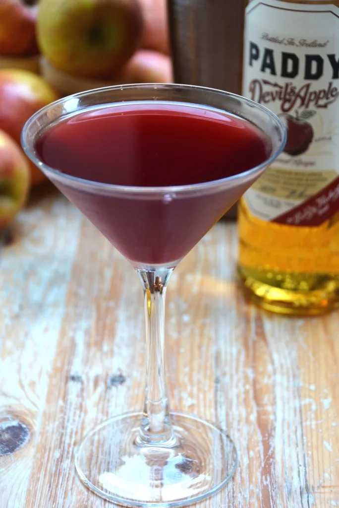 Fill a martini shaker with ice. Add the Paddy Devil's Apple, cinnamon clove simple syrup, and cranberry juice. Shake well, then strain into a martini glass and serve.