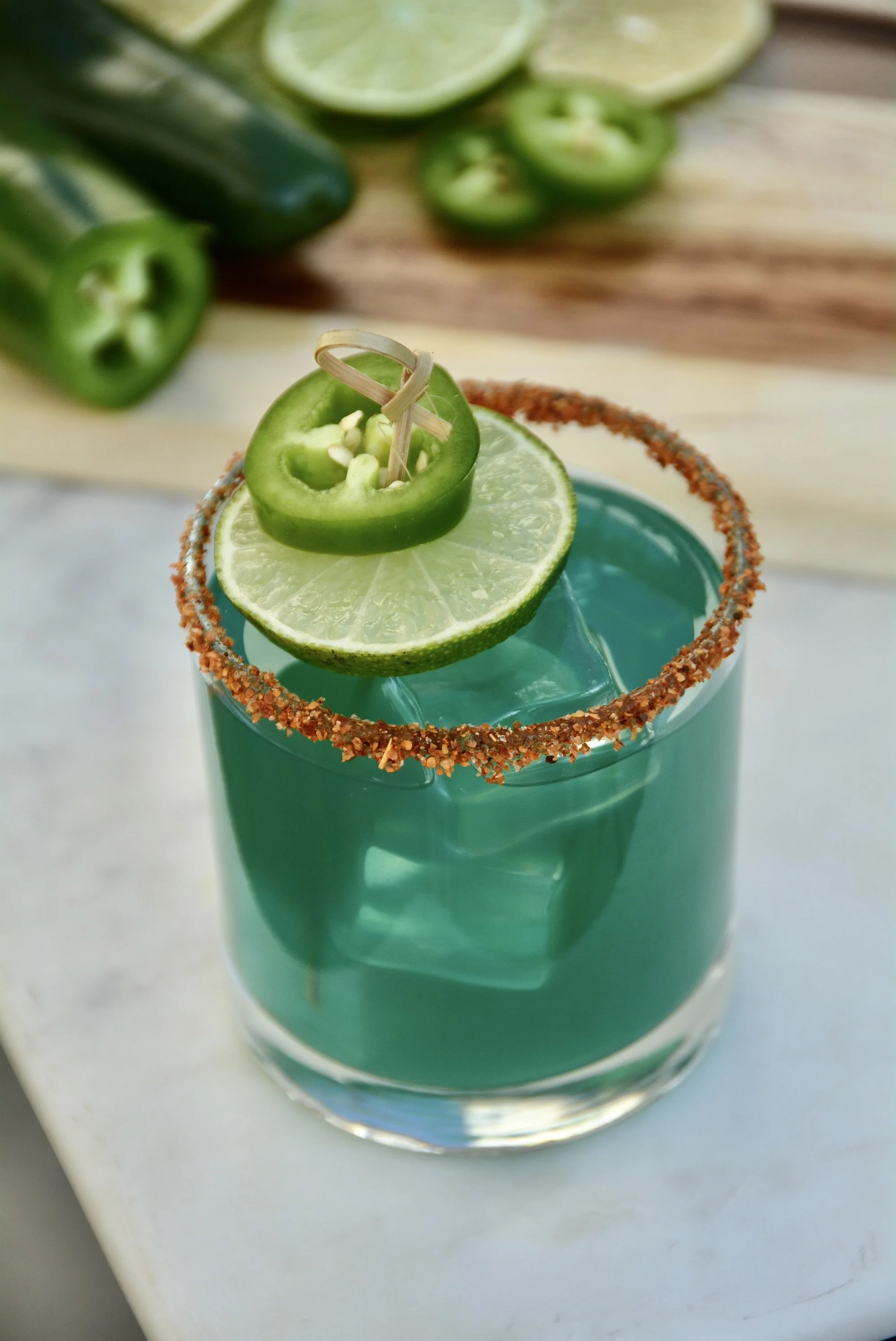 Fire & Ice (Spicy blue margarita with Tajin & Salt rim)