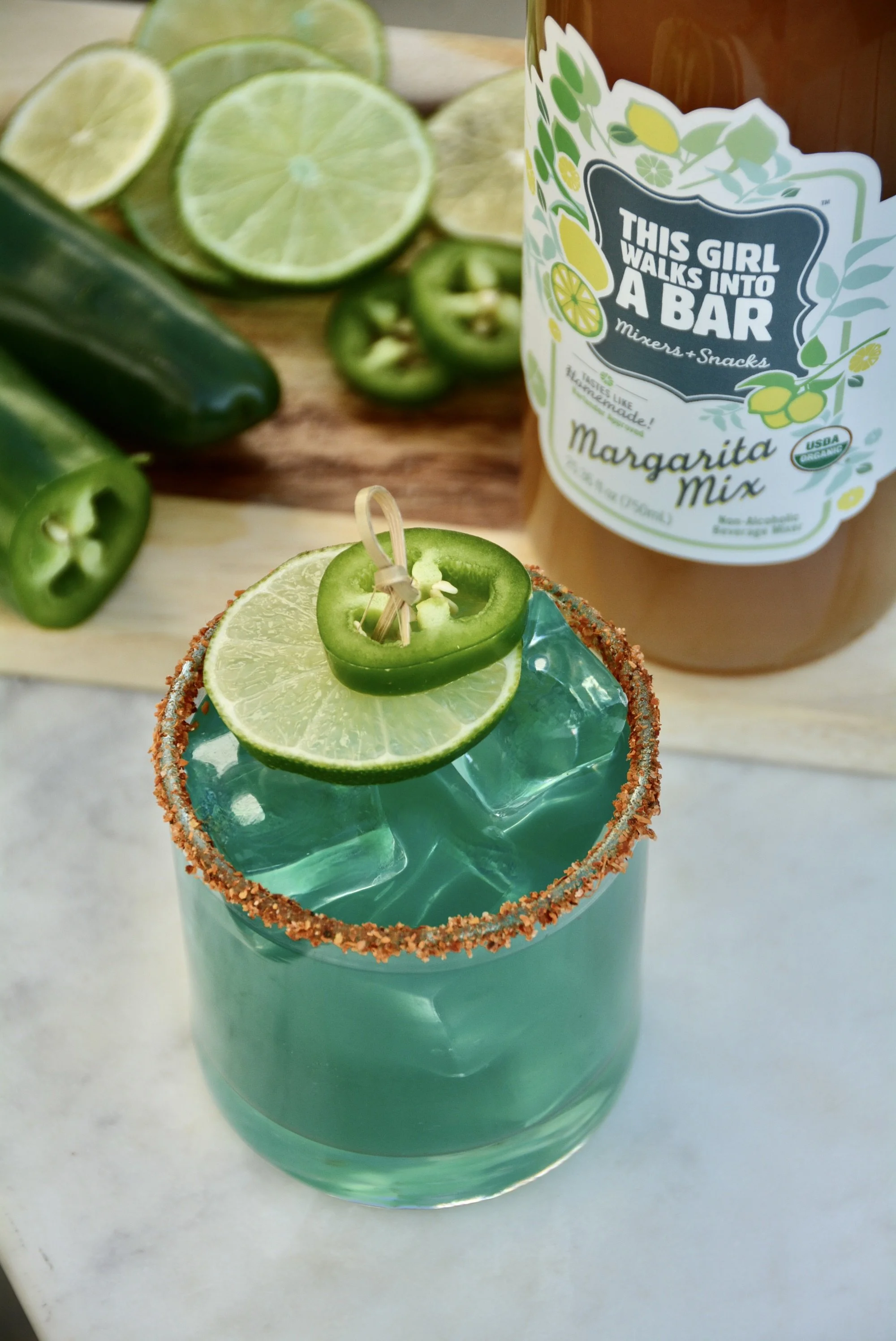 Muddle jalapeno peppers with agave, lime juice, and lemon juice in a shaker. Add blue curacao, tequila, ice & shake. Pour over ice into a glass rimmed with ½ tajin and ½ salt. Garnish with lime wheel & jalapeno.