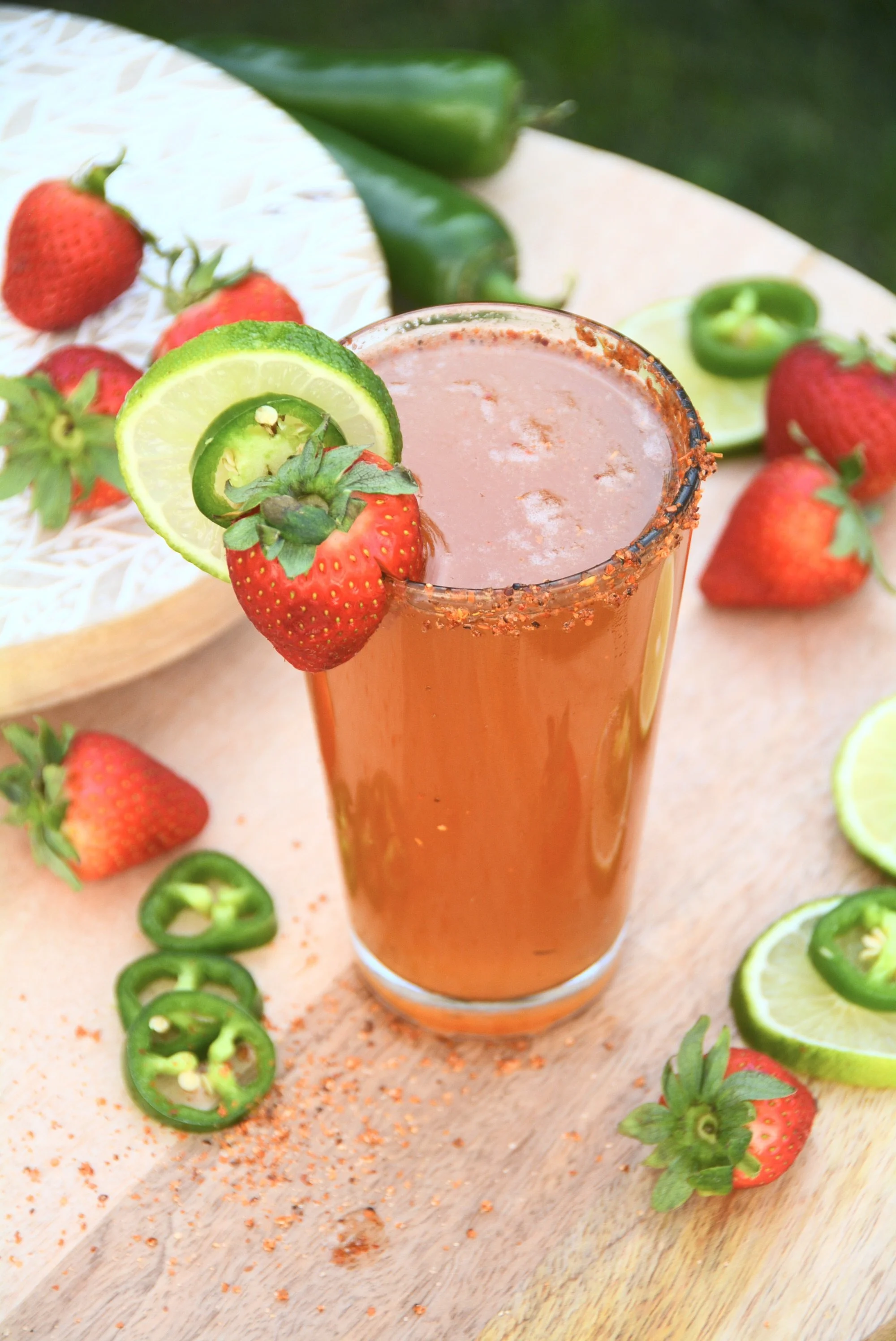 In a martini shaker, muddle the jalapeños and strawberries in the tequila and Margarita mix until they are well broken down. Strain into a chilled beer or pint glass rimmed with Tajín. Slowly add the beer, and garnish with a strawberry and jalapeño.