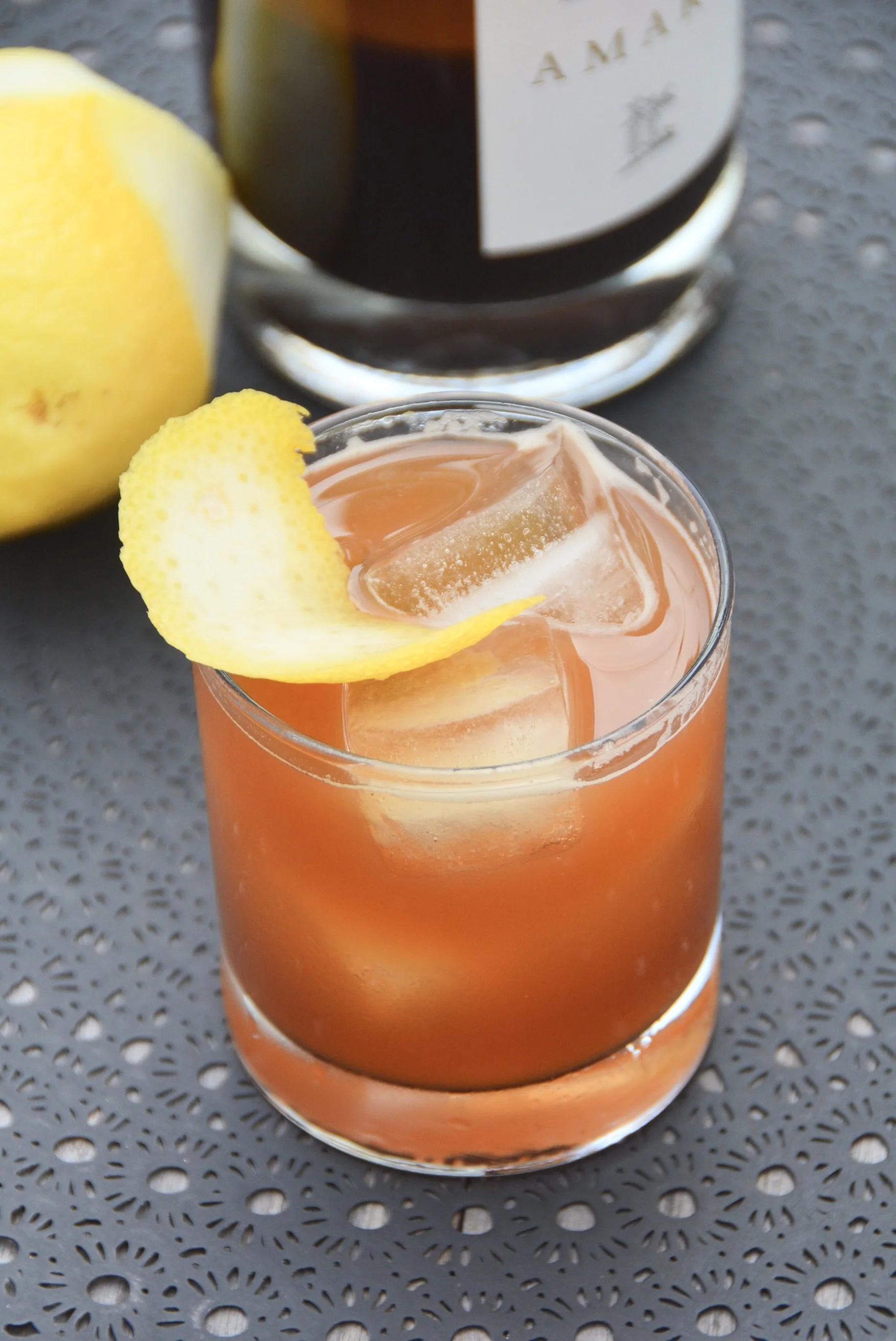 Fill a martini shaker with ice and add all the ingredients. Shake well to mix and pour into a double old fashioned glass filled with ice. Garnish with a lemon peel and serve.