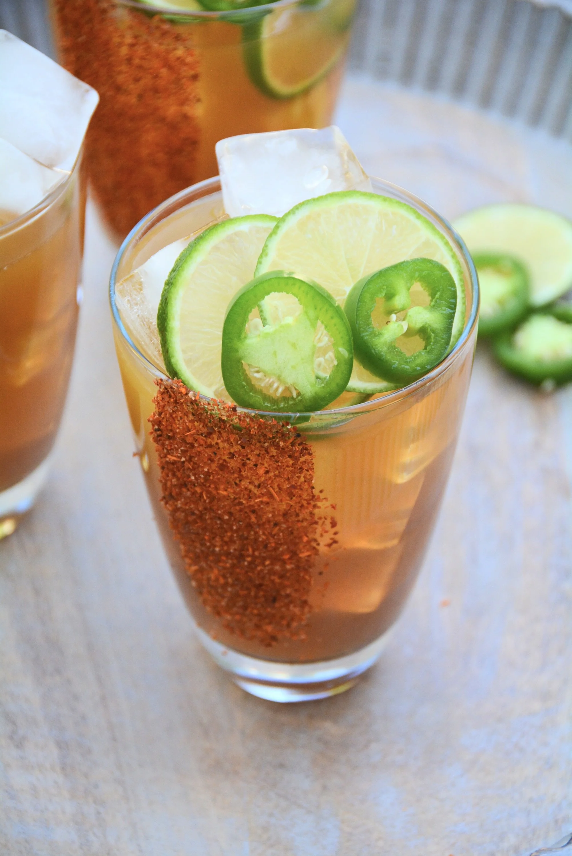 In a martini shaker, muddle the jalapeño slice(s) in the bourbon. Add ice along with the rest of the ingredients. Shake well and strain into a rocks class filled with ice. Stir well and garnish with a limes and jalapeño.