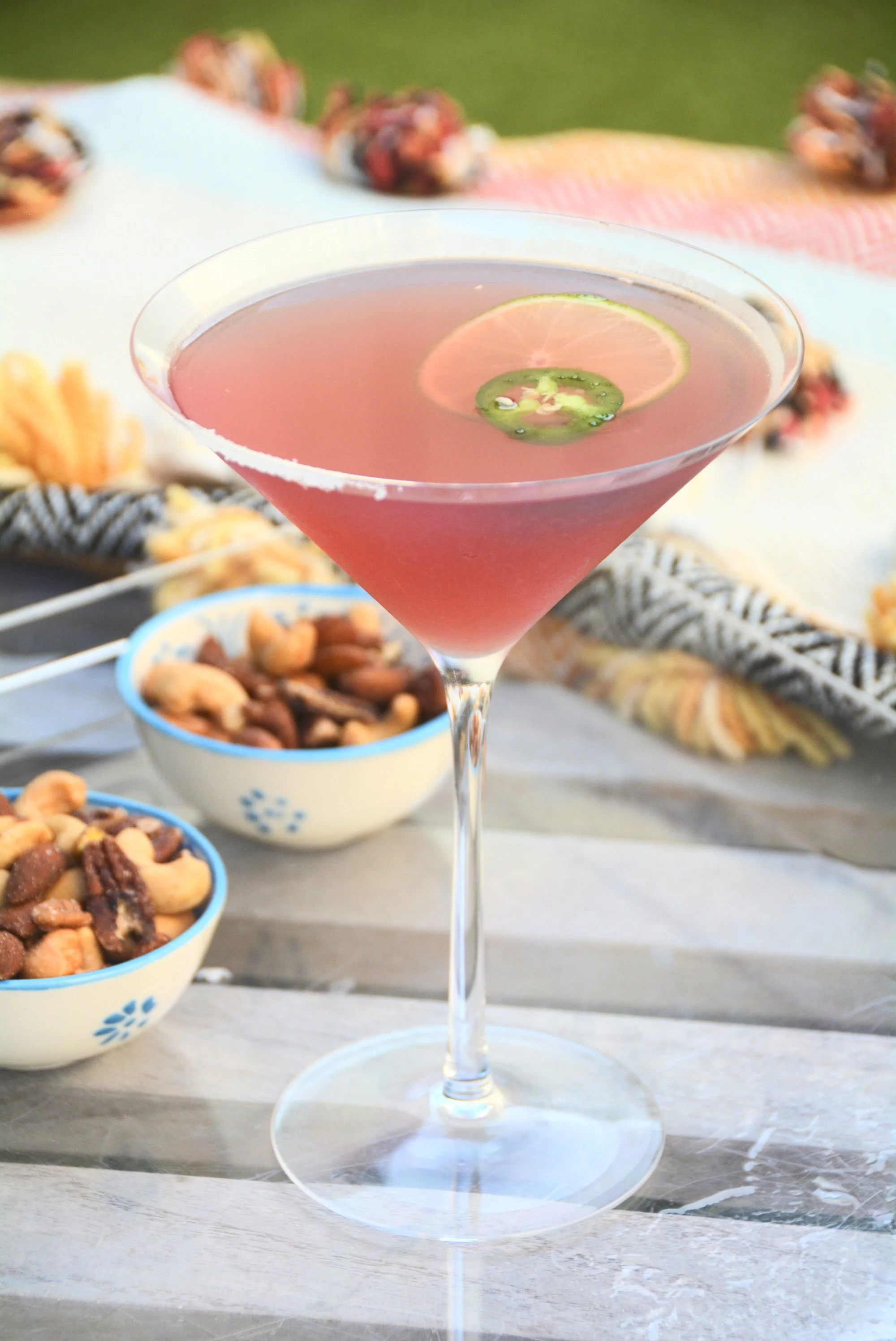 In a martini shaker, muddle the jalapeño slice(s) in the vodka. Add ice along with the rest of the ingredients. Shake well and strain into a large martini glass.